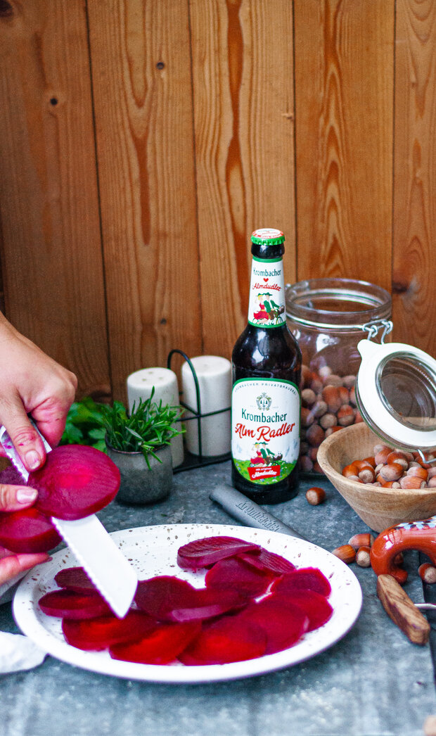 Ein raffinierter Genuss: Ziegenkäse-Taler auf einem Bett aus hauchdünn geschnittenem Rote-Bete-Carpaccio, verfeinert mit einem Walnuss-Balsamico-Dressing. Die Kombination aus der cremigen Textur des Ziegenkäses und der milden Süße der Roten Bete wird perfekt durch das nussige Aroma des Dressings abgerundet. Dazu passt ein kühles Krombacher AlmRadler perfekt.