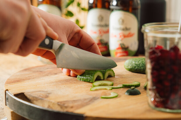 Zunächst wird eine Salatgurke in kleine Scheiben geschnitten.