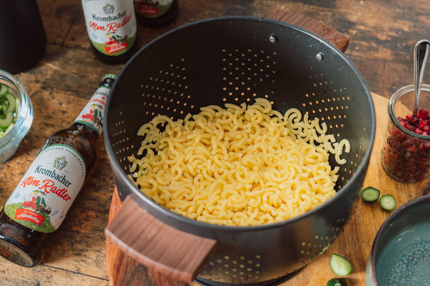 Anschließend werden die Nudeln bissfest gekocht und abgeschreckt.