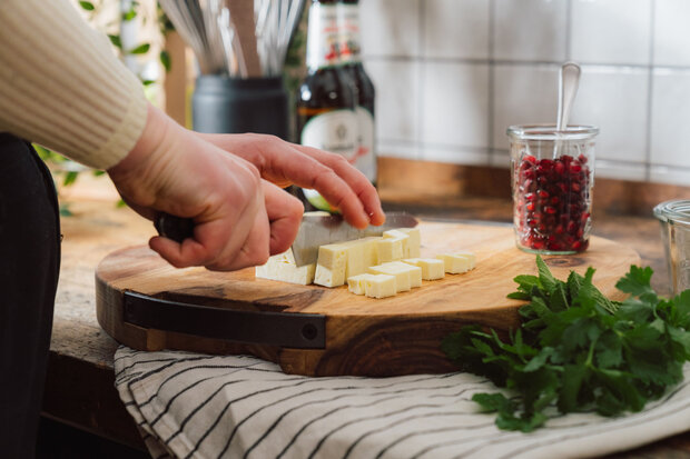 Als nächstes wird der Grillkäse in kleine Würfel geschnitten.