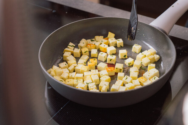 In einer Pfanne wird Olivenöl erhitzt. Sobald das Öl heiß ist, werden die Grillkäsewürfel zusammen mit den Minzblättern von allen Seiten angebraten.