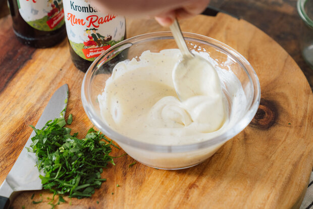 Währenddessen wird das Dressing vorbereitet. Dafür werden saure Sahne, Salatmayonnaise, Tahini, Zitronensaft, Salz und Pfeffer in einer Schüssel gut verrührt.
