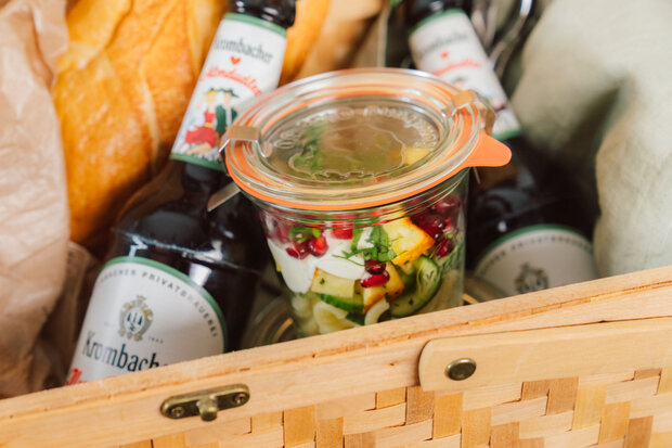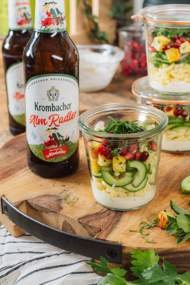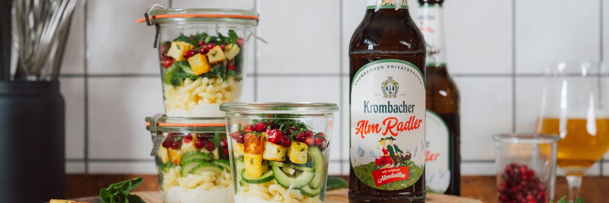 Eine leichte Mahlzeit für unterwegs, die dennoch nicht an Geschmack spart! Dieser erfrischende Nudelsalat mit knackiger Gurke, würzigem Grillkäse und einem cremigen Tahini-Dressing ist der ideale Begleiter für deine nächste Wandertour. Abgerundet mit einem Hauch von Minze und Granatapfel, wird dieser Salat mit einem Krombacher AlmRadler zum perfekten Genusserlebnis – einfach unwiderstehlich!