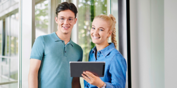 Ein Mann in einem hellblauen Polohemd und eine Frau in einer blauen Jeansjacke stehen nebeneinander. Die Frau hält ein Tablet in der Hand. Im Hintergrund sind große Fenster mit Pflanzen zu sehen.
