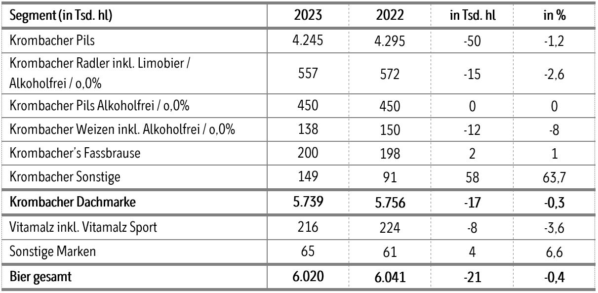 Die allgemein gedämpfte Konsumstimmung, bedingt vor allem durch die hohe Inflation, bekam 2023 auch die Krombacher Gruppe zu spüren. Trotzdem präsentiert das Siegerländer Unternehmen ein zufriedenstellendes Jahresergebnis. So sank der Gesamtausstoß nur minimal auf insgesamt 7,628 Mio. Hektoliter (hl). Im Vergleich zum Vorjahr ist dies ein leichter Rückgang um 0,1 %. Die Dachmarke Krombacher konnte dabei deutlich besser abschneiden als der Branchenschnitt. Mit 5,739 Mio. hl liegt das Minus hier bei lediglich 0,3 %. Der alkoholfreie Markenverbund um Schweppes konnte 2023 dagegen leicht wachsen, nämlich um 1 % auf 1,608 Mio. hl. Der Anteil der alkoholfreien Getränke innerhalb der Krombacher Gruppe beträgt dabei rund 40 %.