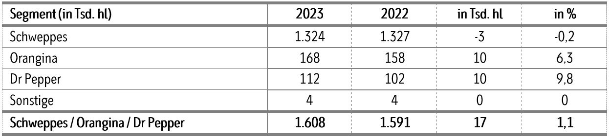 Dem schwierigen Marktumfeld konnte sich Schweppes erfolgreich entgegenstemmen. Die von der Krombacher Gruppe in Deutschland und Österreich vertriebenen Marken Schweppes, Orangina und Dr Pepper verzeichneten zusammen ein Plus von 1 % auf einen Gesamtausstoß von 1,608 Mio. hl. Orangina und Dr Pepper konnten dabei entgegen dem allgemeinen Trend jeweils ein erfreuliches Wachstum erreichen.