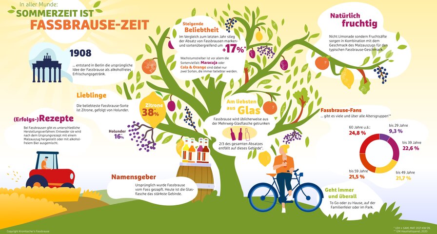 Mehr als 45 Anbieter von Fassbrausen gibt es im deutschen Markt: Mit 39% Marktanteil ist Krombacher’s Fassbrause klarer Marktführer. Dafür gibt es viele gute Gründe: Bei Krombacher erfolgt die Herstellung von Krombacher’s Fassbrause auf Basis eines Malzauszugs. Zudem machen die hohe Qualität, die Verwendung natürlicher Zutaten und das besondere Herstellungsverfahren Krombacher’s Fassbrause zu einem besonderen Erfrischungsgetränk mit 0,00% Alkohol und zur beliebtesten Fassbrause-Marke im deutschen Markt. Zusätzlich ist die Sortenvielfalt ein wesentlicher Erfolgsfaktor: 2012 nahm die Krombacher Brauerei die erste Sorte Krombacher’s Fassbrause in ihr Sortiment auf – mittlerweile gibt es sieben verschiedene Sorten im Portfolio. Der Erfolg gibt ihnen Recht: In dem durch die Corona-Pandemie geprägten Jahr 2020 steigerte Krombacher’s Fassbrause den Ausstoß auf 178.000 Hektoliter.