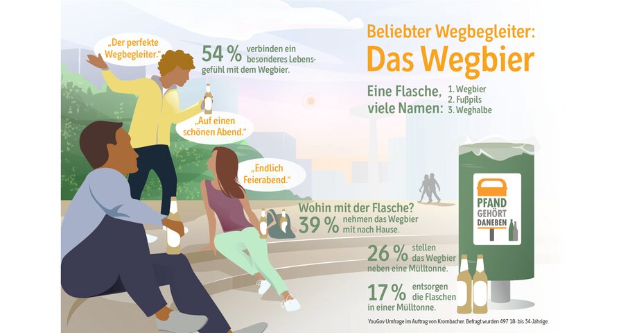 Wegbier? Oder doch eher Fußpils? Jede:r nennt das Bier für unterwegs anders. Eine repräsentative Online-Umfrage von YouGov im Auftrag von Krombacher hat bei den 18 bis 34-Jährigen nachgefragt*. Ergebnis: eine Flasche, viele Namen. Der mit Abstand meistverwendete Name für das Bier unterwegs ist „Wegbier“ (29 %). Doch egal ob Wegbier, Fußpils, Faustmolle oder Weghalbe: Das Schöne am Wegbier ist, es muss nicht groß erklärt werden – es erklärt sich selbst und für jeden ein bisschen anders. Fest verankert im Sprachgebrauch, gelebte Institution bei den Mittzwanziger:innen und denen, die sich danach fühlen. Und Gefühl gehört zum Wegbier dazu. Mehr als der Hälfte der befragten 18 bis 34-Jährigen (54 %) vermittelt es ein besonderes Lebensgefühl. Ob Vorfreude auf einen gelungenen Abend mit Freund:innen, das Einläuten des Feierabends oder als Wegbegleiter bei Spaziergängen: Das Bier auf die Hand ist bei der Mehrheit der Befragten (58 %), die das Prinzip Wegbier kennen, dabei, wenn sie unterwegs sind.