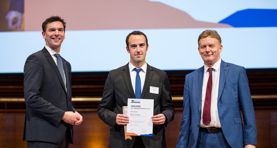 Bildunterschrift: Daniel Teipel (Mitte) erhält die Auszeichnung von Henner Pasch, Präsident der Bergischen IHK (li.) und dem Hauptgeschäftsführer der Bergischen IHK, Michael Wenige (re.).