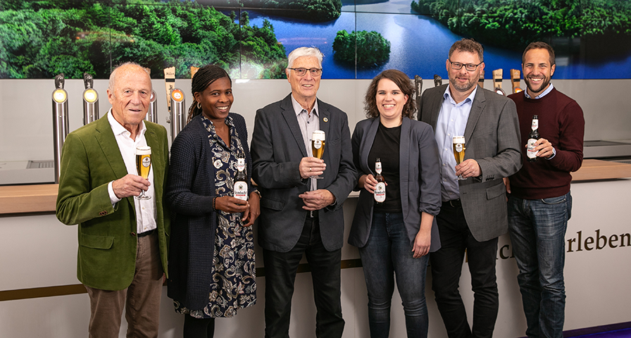 Stoßen auf 50 Jahre Partnerschaft an: Rolf Bernshausen (LGK Gründungsmitglied und Ehrenvorsitzender), Ayodele Buraimoh (2. Vorsitzende LGK ), Adalbert Roßbach (LGK Gründungsmitglied und 3. Vorsitzender), Ann-Kathrin Häner (Sponsoringmanagerin der Vermarktungsagentur DMS für die Krombacher Brauerei), Thomas Klein (1. Vorsitzender LGK) und Krombacher Unternehmenssprecher Peter Lemm.
