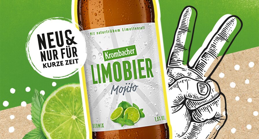 Erfrischende Minze und fruchtige Limette treffen auf einen Schuss Krombacher Pils – mit dem neuen Limobier Mojito bringt Krombacher den Geschmack des Sommers in die Regale. Seit 2020 ist Krombacher Limobier die sommerliche Erfrischung mit fruchtig-limonadigem Geschmack und nur 1,5% Alkohol. Jetzt erweitert Krombacher mit der limitierten Aktionssorte die Sortenvielfalt und präsentiert mit Limobier Mojito einen fruchtigen Biermix mit Limetten-Minz-Limonade.