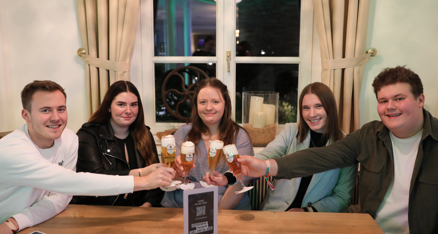 Die glückliche Gewinnerin Sara S. (Bildmitte) stößt mit einem Teil ihrer "Segelcrew" in der Krombacher Erlebniswelt in Krombach an.