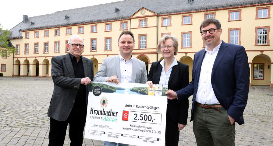 Bildunterschrift: Der Krombacher Gebietsverkaufsleiter Christian Dahlenkamp überreicht den ersten Spendenscheck an das Künstler:innen-Projekt der Universität Siegen (v. l. n. r.: Vorschlaggeber Prof. Dr. med. Peter-Jörg Funke, Krombacher Gebietsverkaufsleiter Christian Dahlenkamp, Rektorin der Universität Siegen Prof. Dr. Stefanie Reese und Direktor Museum für Gegenwartskunst Thomas Thiel).