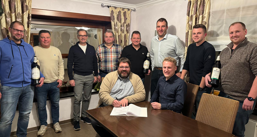 Bei der offiziellen Vertragsunterzeichnung: 1. Schützenhauptmann Christian Hainbach und Krombacher Gebietsverkaufsleiter Joshua Grund (sitzend v. l. ) mit Christian Pöppel (3. Schützenhauptmann), Christoph Bald (Geschäftsführer), Stephan Rödder (Regionalvertriebsdirektor Krombacher Brauerei), Mark Hummelsiep (Beisitzer 2. Kompanie), Thomas Bald (Beisitzer 1. Kompanie), André Kloos (Wirtschafter), Lukas Beul (Verkaufsleiter Eventplanung GVS) und Oliver Schlaf (Beisitzer 3. Kompanie) (stehend v. l. ).