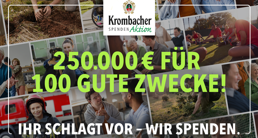 Ab sofort können wieder Vorschläge bei der Krombacher Spendenaktion eingereicht werden, um gemeinnützige Organisationen und Vereine in Deutschland zu unterstützen. Die Brauerei stellt dafür eine Gesamtsumme von 250.000 Euro zur Verfügung. Davon profitieren 100 soziale Einrichtungen, Organisationen und Vereine, die sich in besonderer Weise für das Gemeinwohl engagieren. Ob Sportvereine, Naturschutzprojekte oder Nachbarschaftshilfen – jeder Vorschlag zählt!
