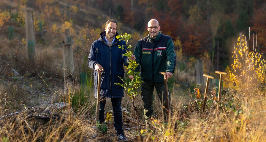 Symbolischer millionster Baum der Cash-Korken Aktion: Peter Lemm (Krombacher, links im Bild) und Matthias Vollpracht (Wald und Holz NRW, rechts im Bild) bei der Pflanzung in Hilchenbach-Müsen.