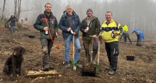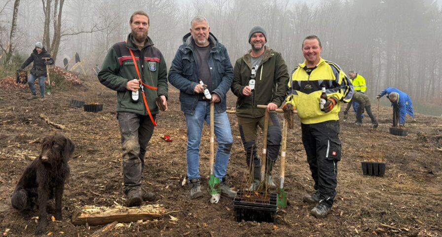 Auf eine erfolgreiche Pflanzaktion: Leon Ochs (kommissarischer Revierleiter), Bischoffens Bürgermeister Marco Herrmann, Maik Gelencer (Verkaufsleiter GIM & Lütticke, Krombacher Gruppe) und Thorsten Lange (Ortsvorsteher Wilsbach).