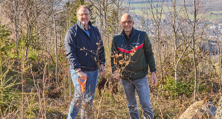 Bildunterschrift: Wolfgang Schötz, Leiter Nachhaltigkeitsmanagement der Krombacher Brauerei (li.) und Matthias Vollpracht, Fachgebietsleiter für den Staatswald von Wald und Holz NRW im Sieger‑/Sauerland (re.), pflanzen am Kindelsberg gemeinsam einen Setzling als Zeichen der starken Partnerschaft für mehr Wald.
