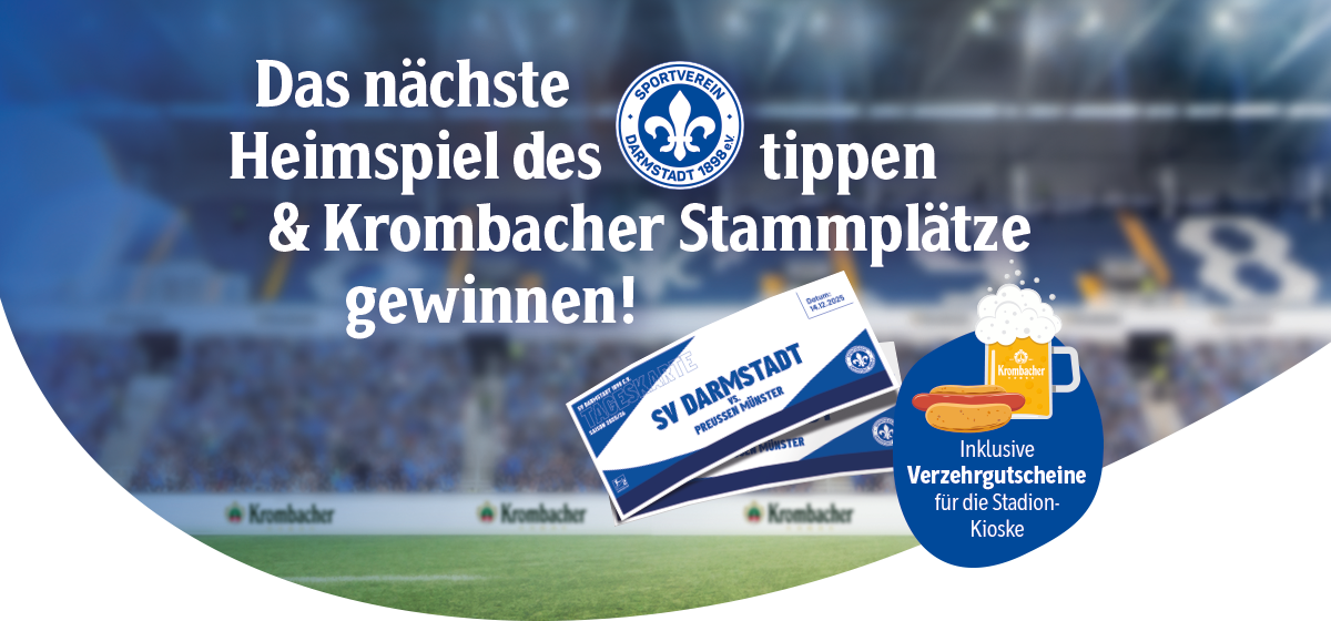 Gewinne zwei Krombacher Stammplätze inkl. Verzehrgutscheine für die SV Darmstadt 98 Heimspiele der Saison 25/26 – Schau hier regelmäßig vorbei und nimm an den Tippspielen teil.