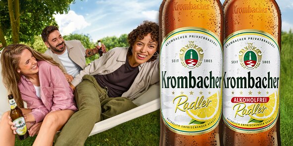 Deutschlands beliebtestes Pils trifft auf Österreichs beliebteste Alpenkräuterlimonade. Daraus entsteht das erste Krombacher AlmRadler mit original Almdudler.